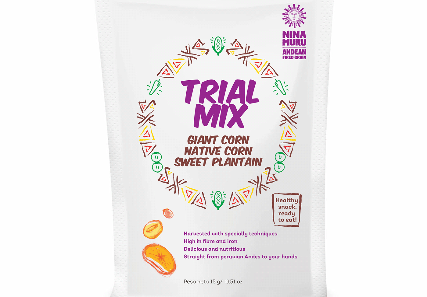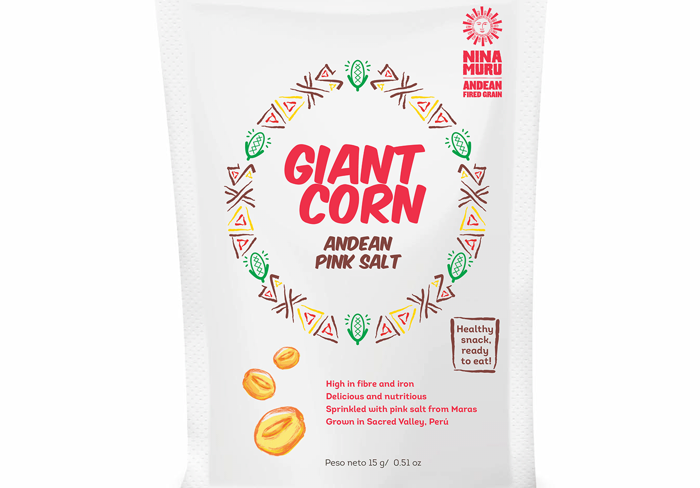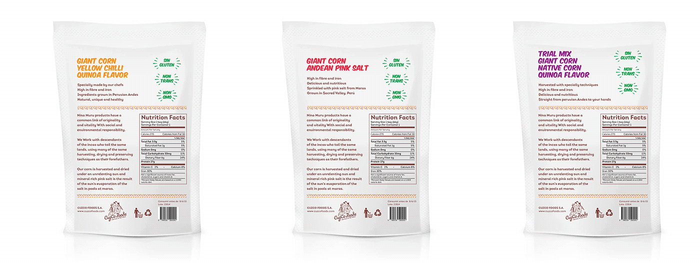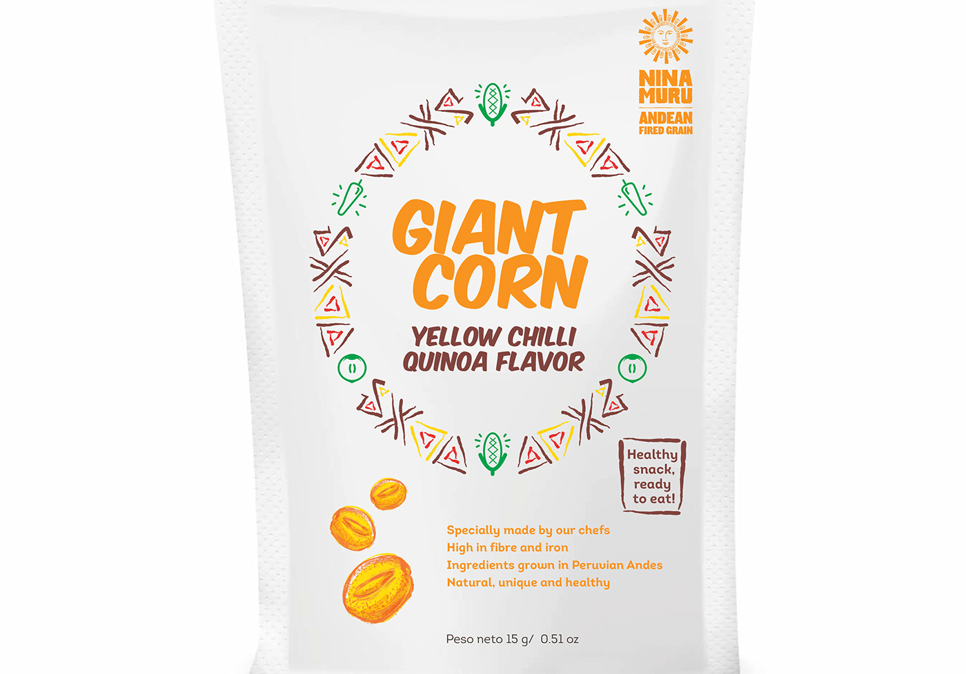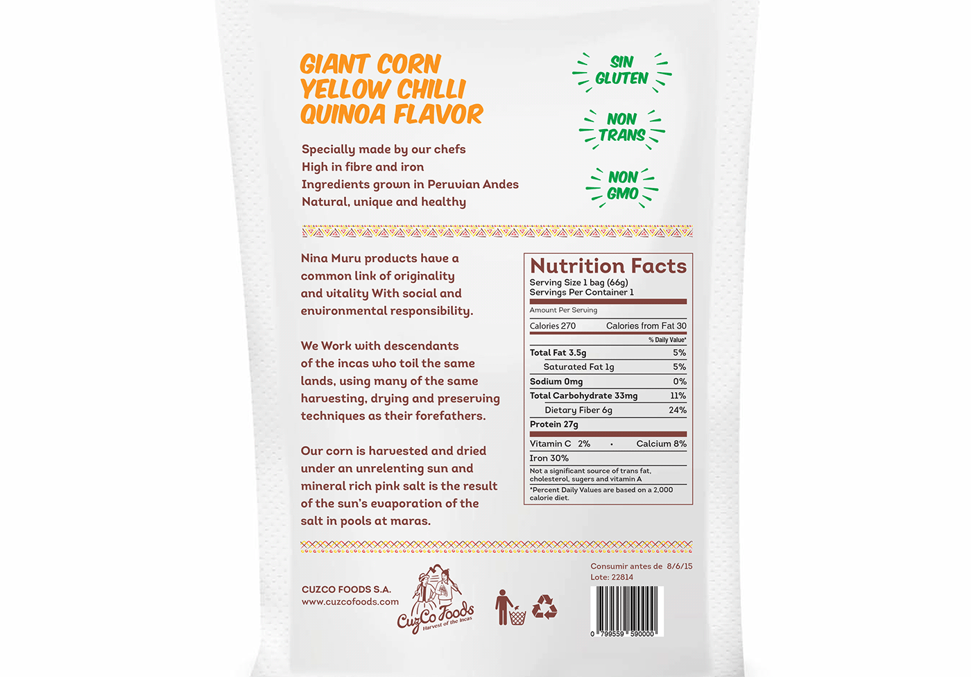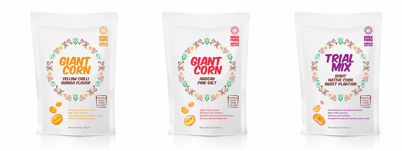 The picture above shows a rebranding packaging example for Nina Muru’s delicious Giant Peruvian Corn Snacks. The giant corn in Peru is only grown in Cuzco, high in the Andes. It has been cultivated there for centuries. This product is non-GMO, gluten-free, trans fat-free, and high in iron and fibre. This dish is spiced with Peruvian yellow chili and Andean quinoa